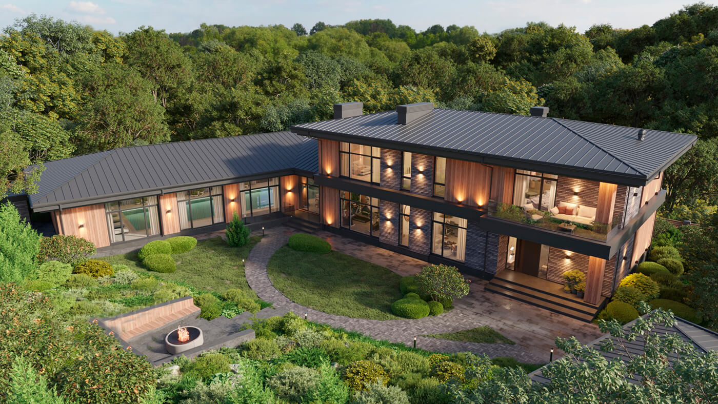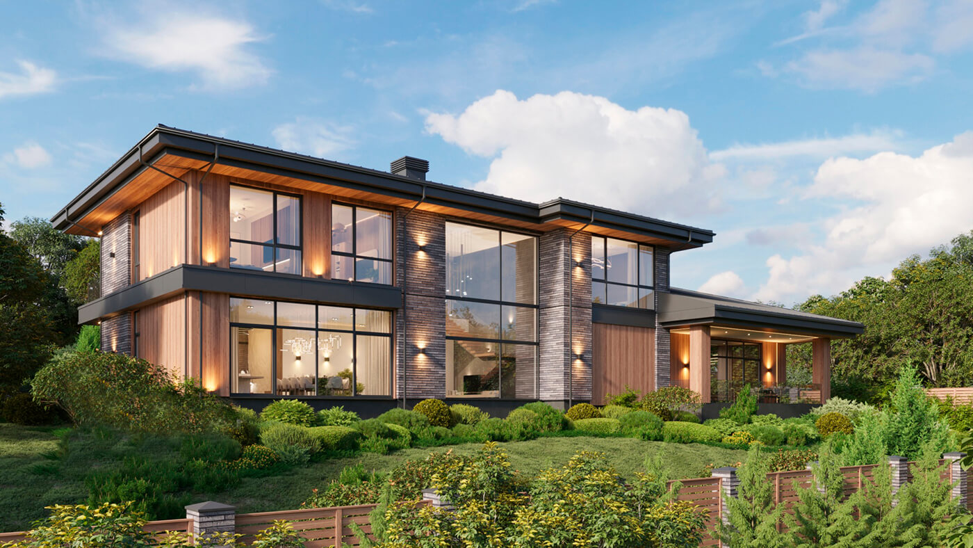 Дом выполнен в современном стиле с использованием натуральных материалов, гармонично вписывающихся в природный ландшафт.
