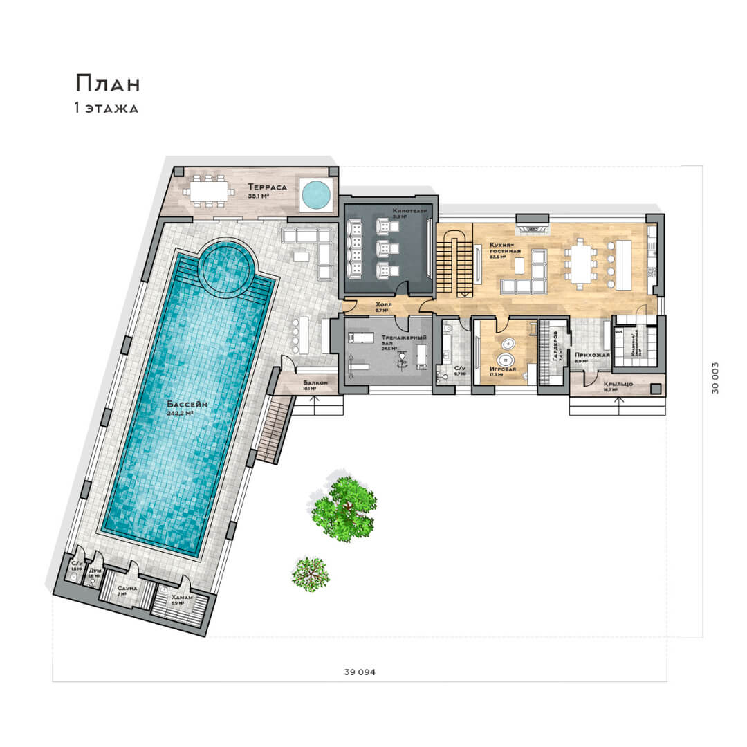 Первый этаж представляет собой общую территорию с кухней-гостиной, игровой зоной, тренажёрным залом, домашним кинотеатром, бассейном с выходом на террасу, сауной и хамамом.