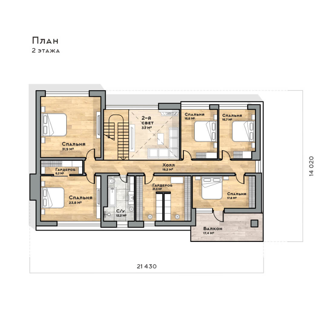 Второй этаж - приватная зона с пятью спальнями: главной спальней для супругов, детской и тремя гостевыми спальнями. Все помещения спроектированы с учетом комфортного проживания семьи и наслаждения панорамными видами на Москву-реку.