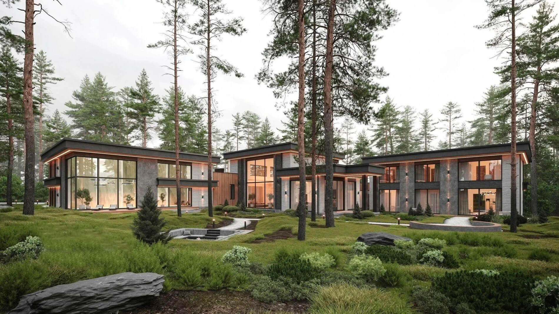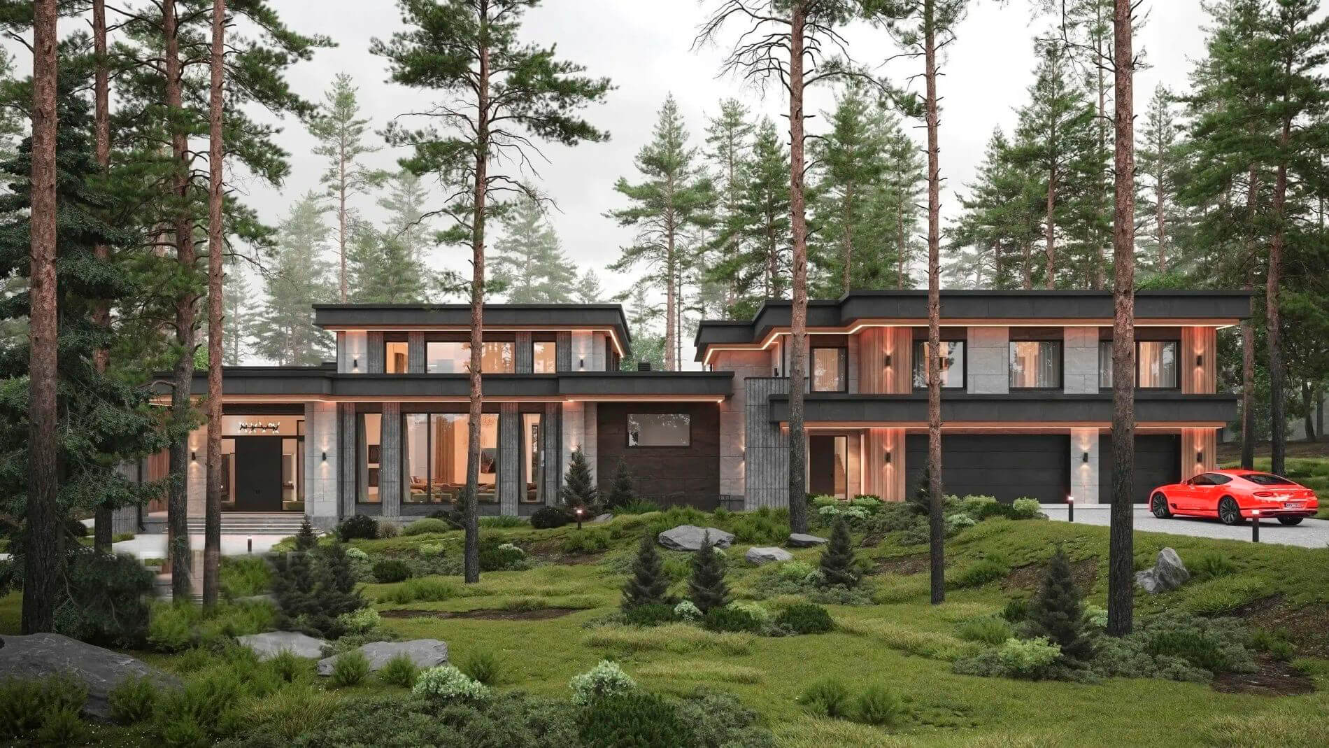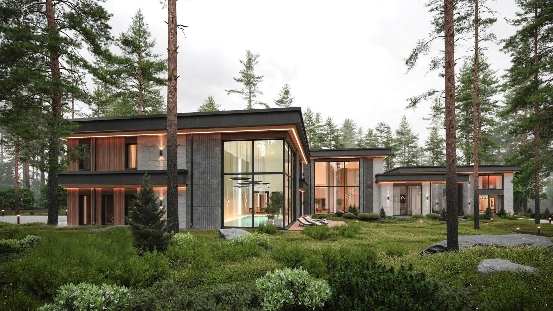 Проект ГрандВью - это дом среди сосен, форма которого продиктована окружающим ландшафтом. Архитекторы сохранили каждое важное дерево на участке, создав комфортное пространство на трех уровнях общей площадью 1714 м².