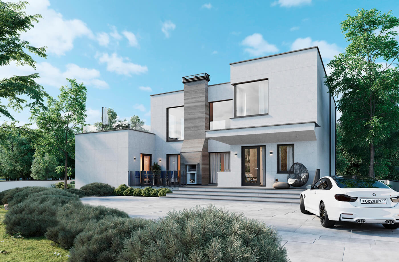 Сердце дома — столовая-кухня-гостиная на первом этаже. Четыре спальни с гардеробными распределены по двум этажам. Просторные террасы, одна из которых с камином, предназначены для проведения досуга в тёплый сезон.