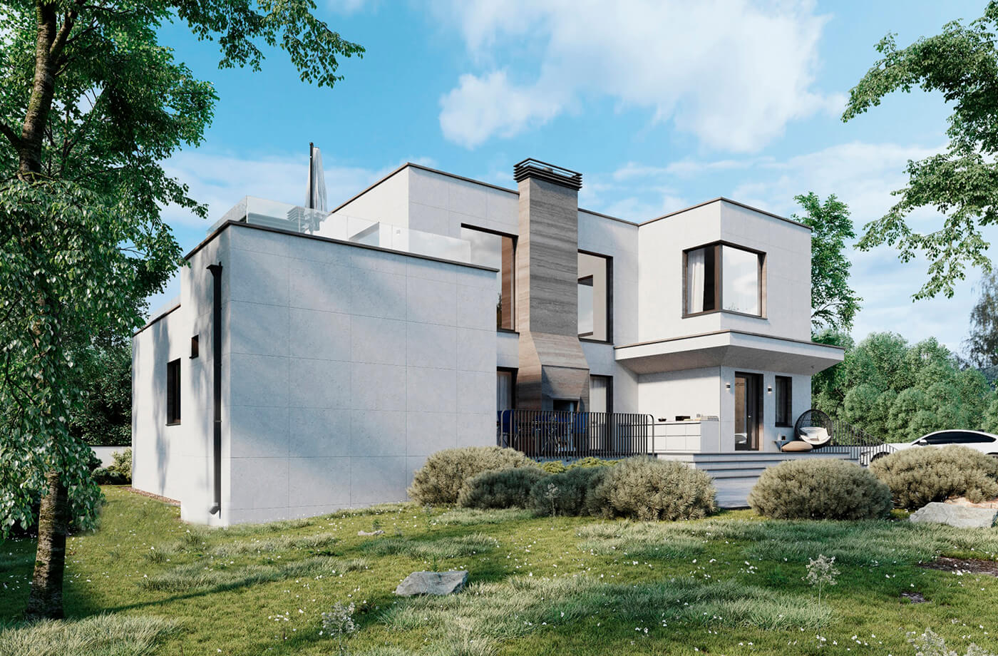 В результате, несмотря на все сложности и специфику технических моментов проектирования, был разработан дом площадью 426 кв.м., с плоской кровлей, панорамными окнами и вторым светом.