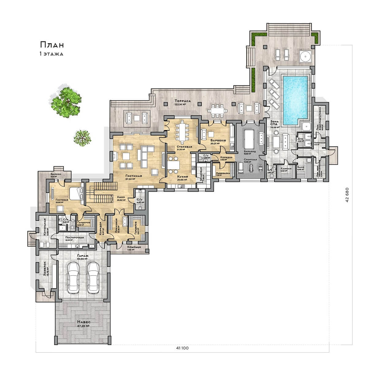 • Бассейн 80 м² с зоной СПА, баней и хаммамом