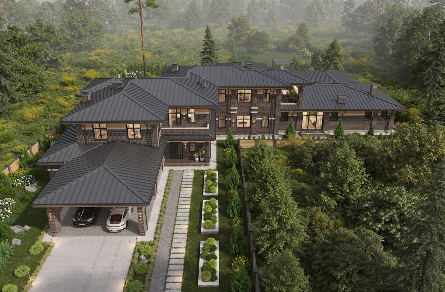 • Фасады из тёмного кирпича с планкеном и горизонтальными линиями