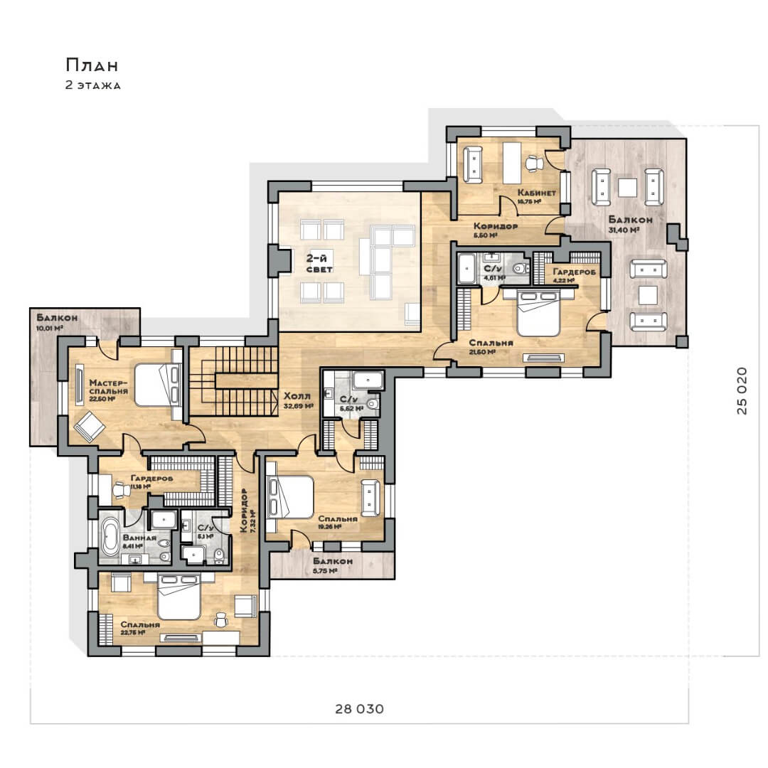 Второй этаж включает 5 спален, каждая с собственной ванной комнатой. Для трёх спален предусмотрены балконы с живописными видами. Пространство организовано для комфортного отдыха и уединения всех членов семьи.