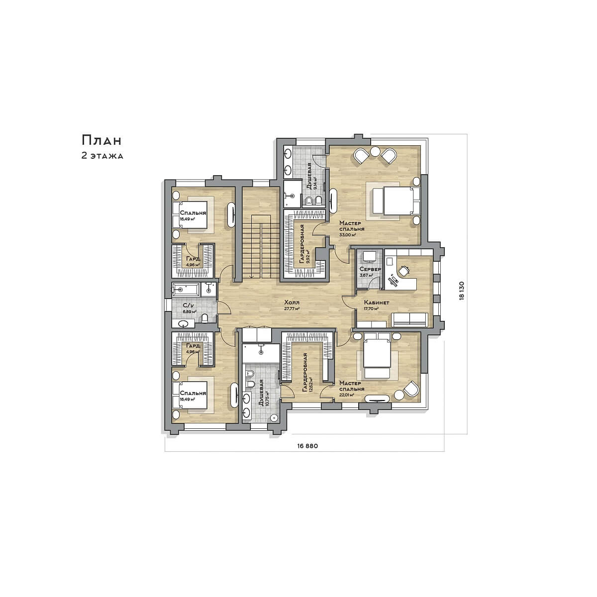 Второй этаж предназначен для основной семьи - спальни родителей, сына с супругой и двух внуков с отдельными комнатами.