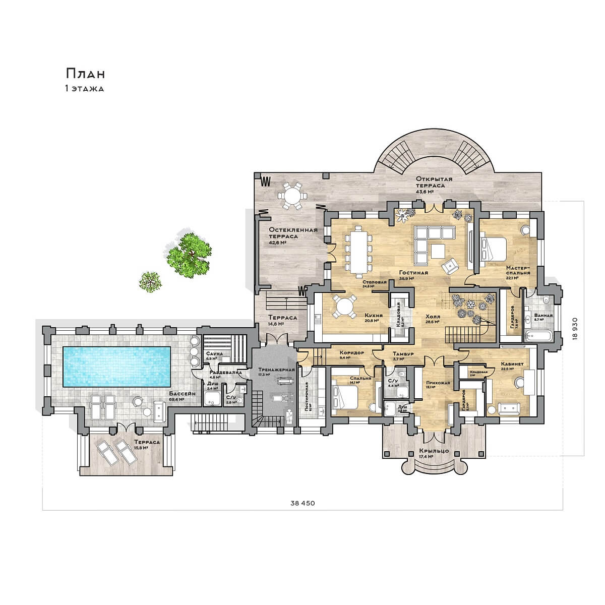 Первый этаж является сердцем дома в духе старорусской усадьбы. Здесь расположена обширная общая зона с гостиной, кухней и столовой, велнесс-зона с бассейном и сауной, мастер-блок для родителей, кабинет и гостевая спальня. Терраса с зоной мангала создает идеальное пространство для семейных gathering.