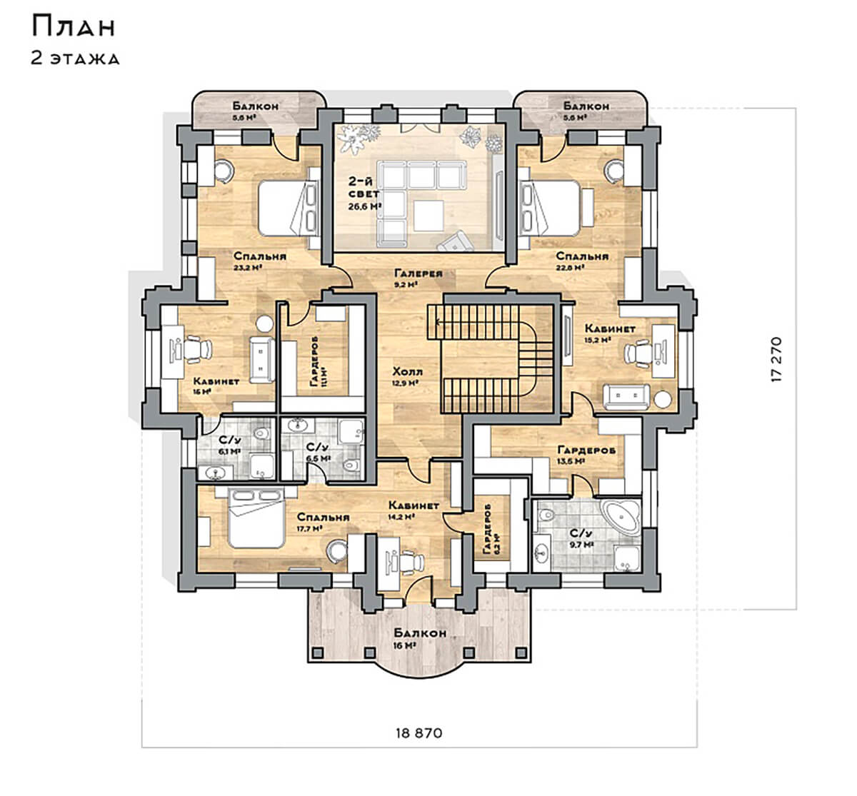 Второй этаж полностью отведен под три полноценных мастер-блока для детей. Каждый блок включает спальню, гардеробную, санузел и кабинет. Пространство организовано с учетом потребностей растущей семьи и создания личного пространства для каждого ребенка.