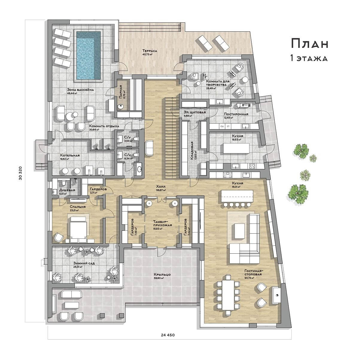 Первый этаж включает просторную гостиную, две кухни (основную и черновую), комнату для творчества, комнату для отдыха, зимний сад, SPA-зону с бассейном и технические помещения. Широкоформатное остекление создает ощущение единения с природой.