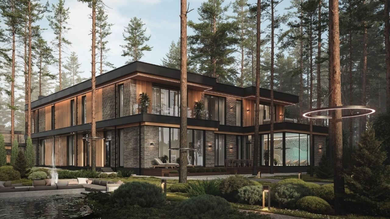 • Фасады отделаны ригельным кирпичом и планкеном из лиственницы