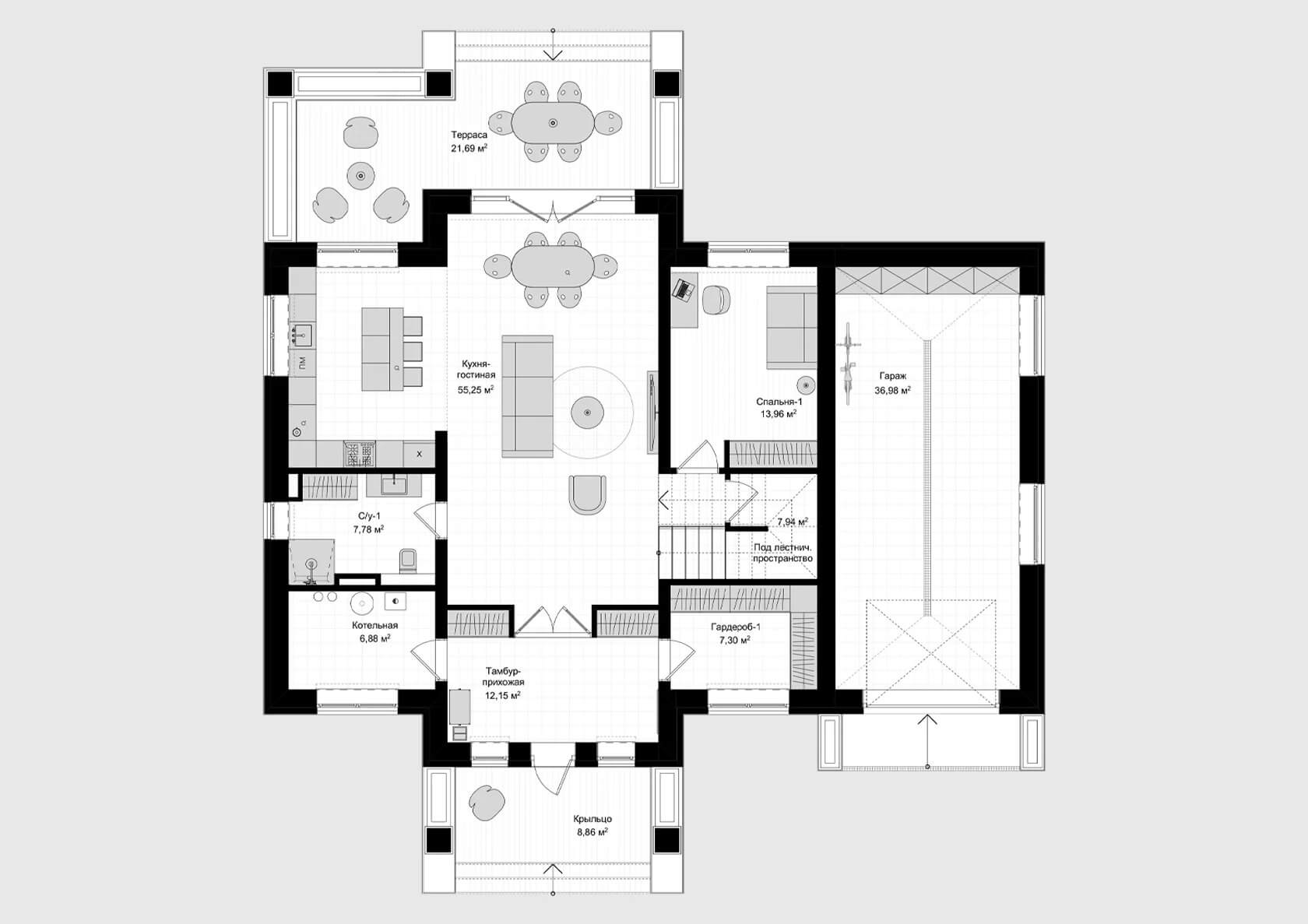 Первый этаж включает гостиную, кухню, кладовую, спальню, 2 ванные комнаты, котельную, гардеробную, террасу, крыльцо, холл и тамбур. Площадь помещений составляет 111,26 м², площадь террасы, крыльца и гаража - 67,53 м².