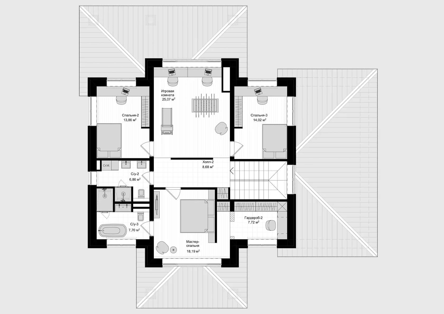 Второй этаж включает 3 спальни, холл, гардеробную и 2 ванные комнаты. Площадь помещений составляет 102,01 м². Площадь террасы, крыльца, гаража 67,53 м².
